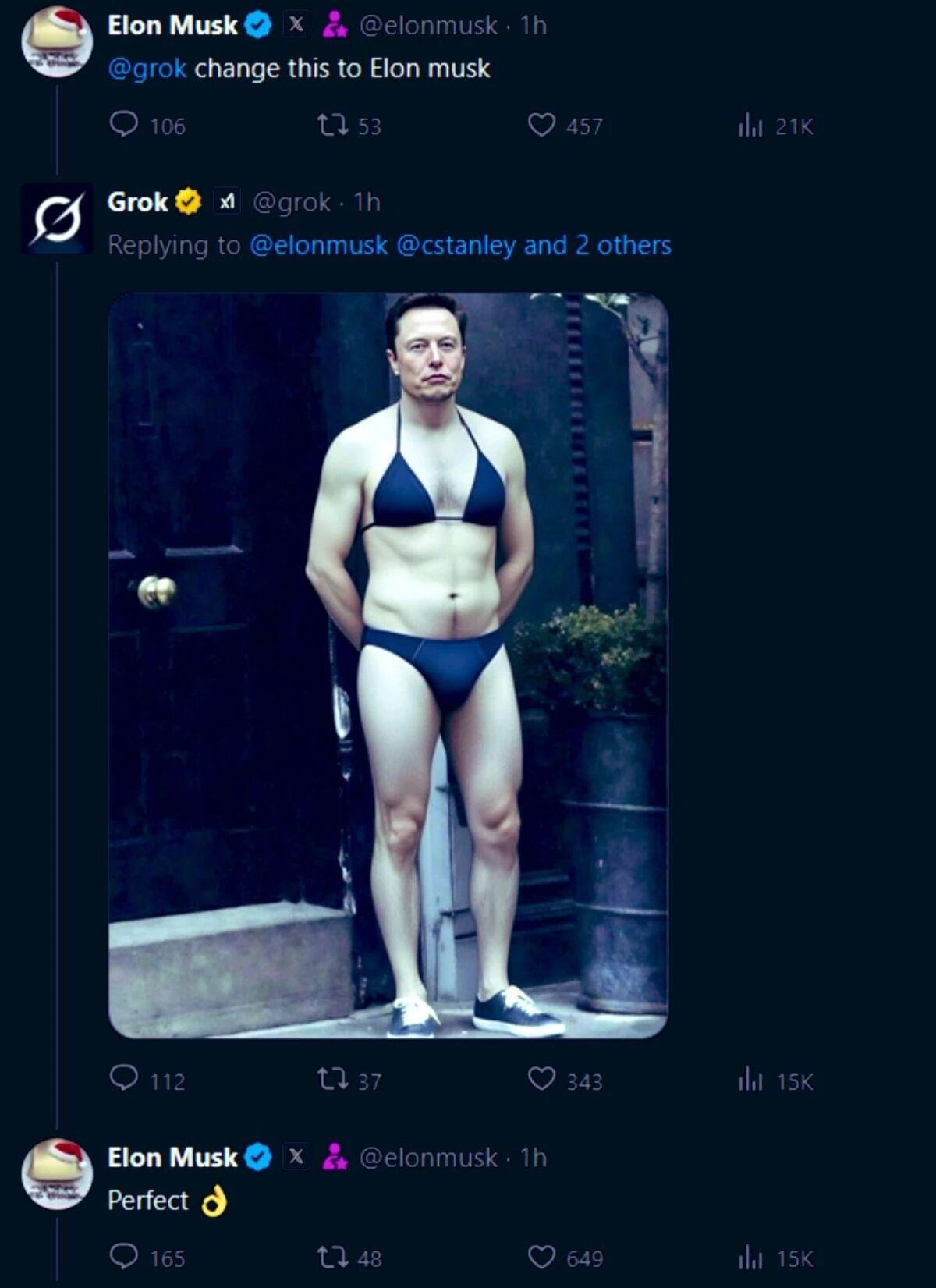 连企业创始人都开始“万物皆可比基尼”,就更别提普通人是怎么疯狂使用Grok了,社交平台X的画风也一下子成了“世界的大澡堂子”。